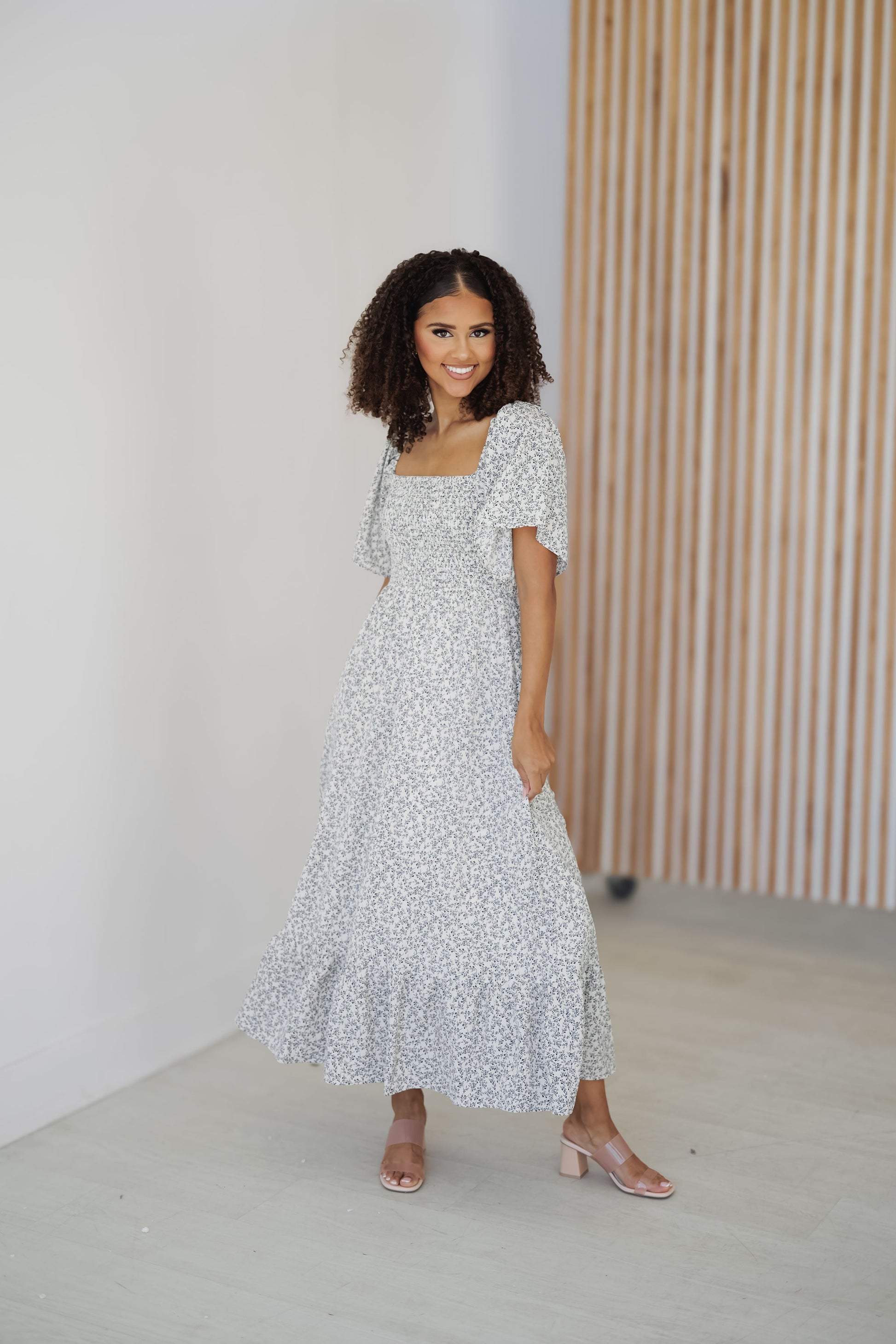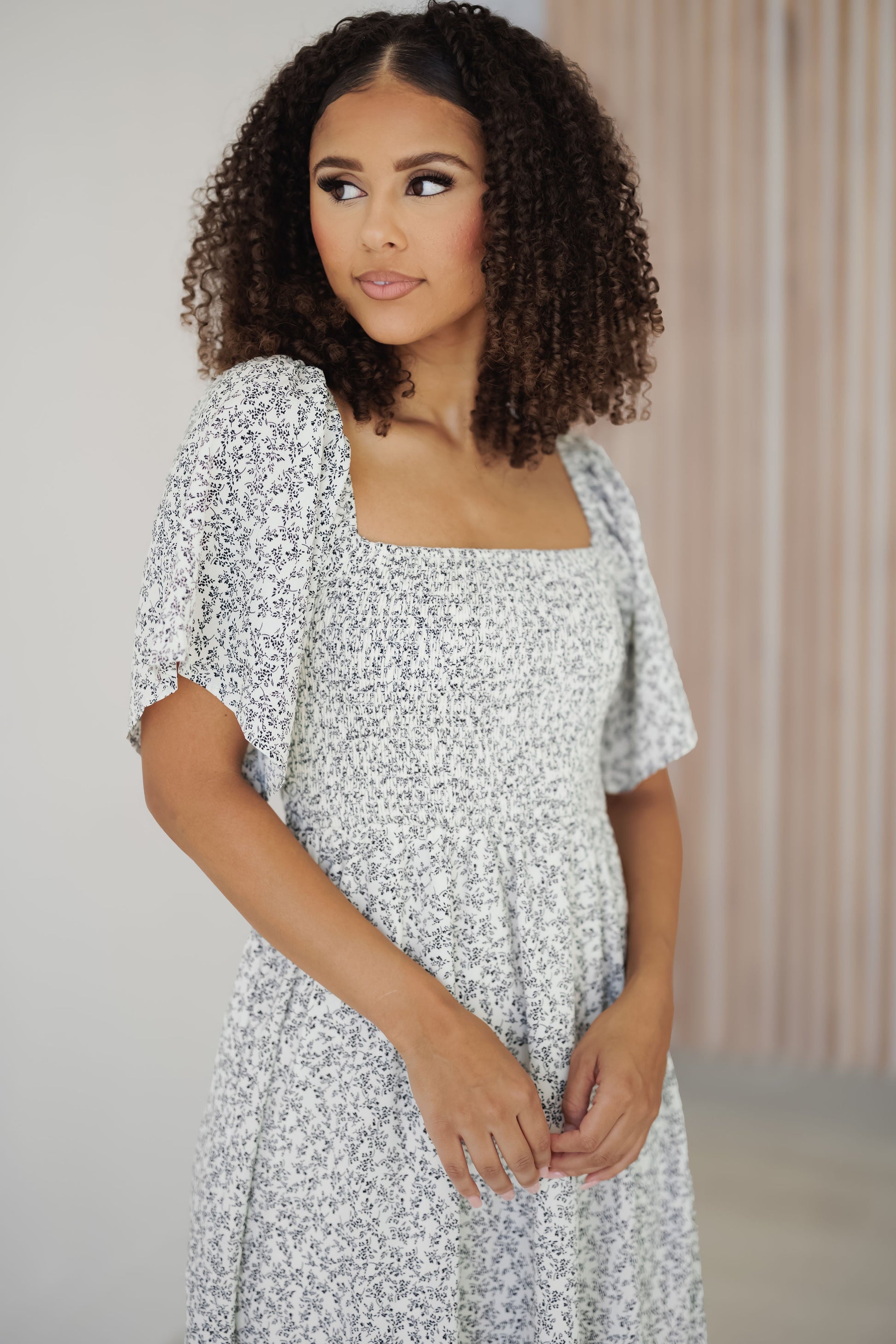 Embrace simplistic charm in the "Alicia Dress!" This classic midi dress is a stunning and timeless option for the fall, as well as transitioning into winter. Featuring a white base with black florals throughout, along with a fully smocked top and side pockets, this dress is effortlessly flattering. The short flowy sleeves make this dress even more feminine and versatile!
